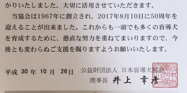 12月12018インフォメーションみなさんこんにちは! 今日はみなさんにご報告があります。 盲導犬育成のため、当院でも募金箱を設置し、たくさんの方に募金のご協力をいただきました。 先日、盲導犬協会より受領書が届きましたのでお知らせいたします。 『盲導犬育支援募金』 総額:23688円 受領日 平成30年10月26日 ご協力ありがとうございます! Post navigationPreviousPrevious post:冬に向けてNextNext post:年末年始休診のお知らせ
