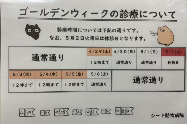ゴールデンウィークの診察については通常通り、火曜日休診日祝、午前診療となります。 期間中混み合うことが予想されますので、お時間に余裕を持ってご来院ください🙇🏻♀️